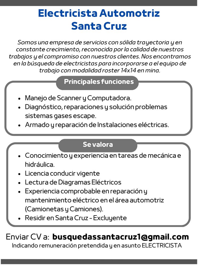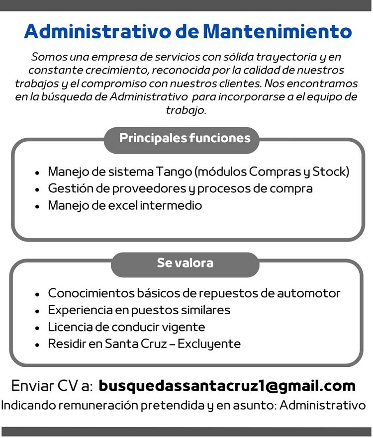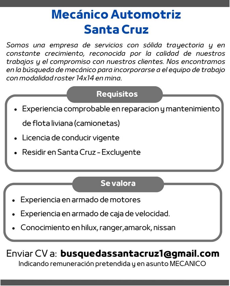 Santa Cruz-, Empresa de servicios con operaciones en Santa Cruz, se encuentra realizando una búsqueda laboral de gran relevancia, con el objetivo de conformar un equipo de trabajo local para los siguientes puestos: